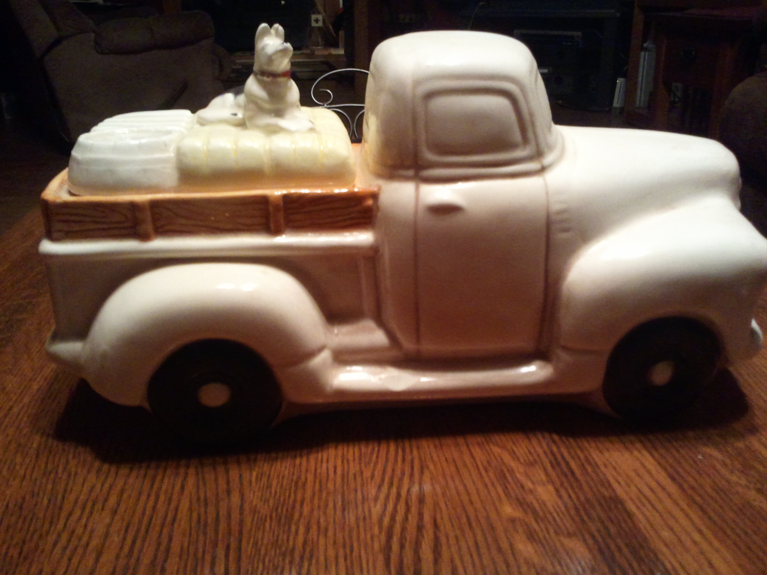 So let me describe the gift and why I thought it was perfect and see if you agree.   It was a ceramic cookie jar, in the shape of an old pickup truck, with ceramic bales of hay in the back, and a ceramic black and white dog lying on top of the hay.  To open it, you lifted the dog’s head, and the dog and the bales of hay came off, the cover to where the cookies would be stored.   The reasons I thought it’d be perfect included: