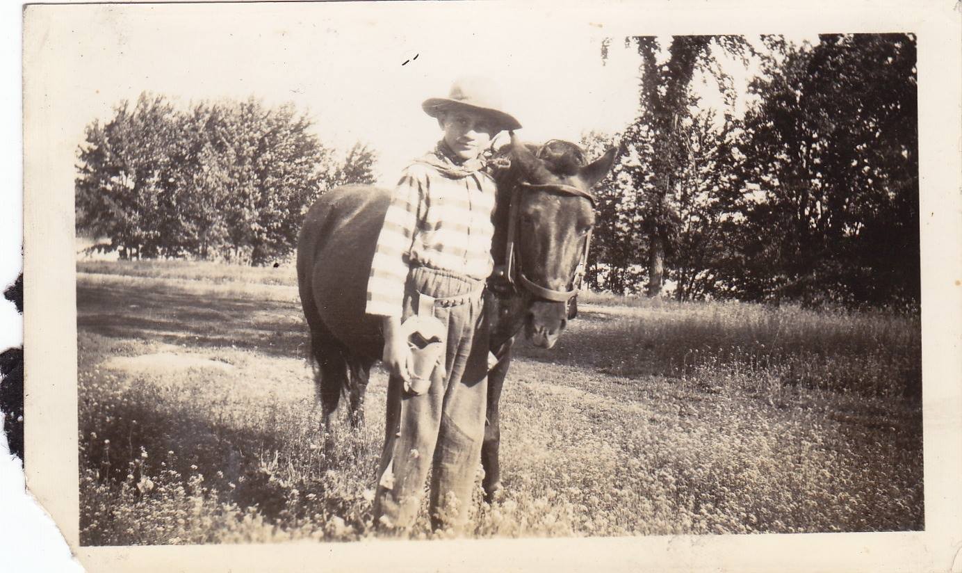 In the photo he’s with his horse and dressed as a cowboy, complete with a hat, kerchief, and a holstered pistol on his belt. I remember him telling stories about his horse and the time and adventures they spent together. I recognize where he is standing, in the driveway to the old farm house he grew up in, with the Chippewa River flowing behind him. And when I look close I can recognize him, my dad, the same slight smile, a hint of sadness coupled with an unshakable and almost defiant confidence, and the same dark eyes through which he saw a world where wonder and humor always trumped grief and sorrow.