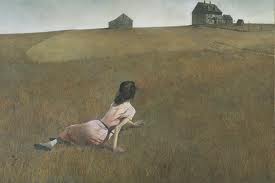 One of my favorite paintings is Christina’s World, by the great American artist, Andrew  Wyeth.  For years now, a reproduction of the painting has hung on my living room wall.  The subject of the painting is a middle aged woman, crippled by polio, who Wyeth observed crawling to her neighbor’s field.  The painting always had an impact on me, the composition that Wyeth uses to dramatically heighten the vastness of the landscape, the absence of trees, the empty sky and the weathered buildings, and the woman, somehow both small and large, dominated by and dominating the landscape at the same time, with her withered arms and twisted feet and faded pink dress.